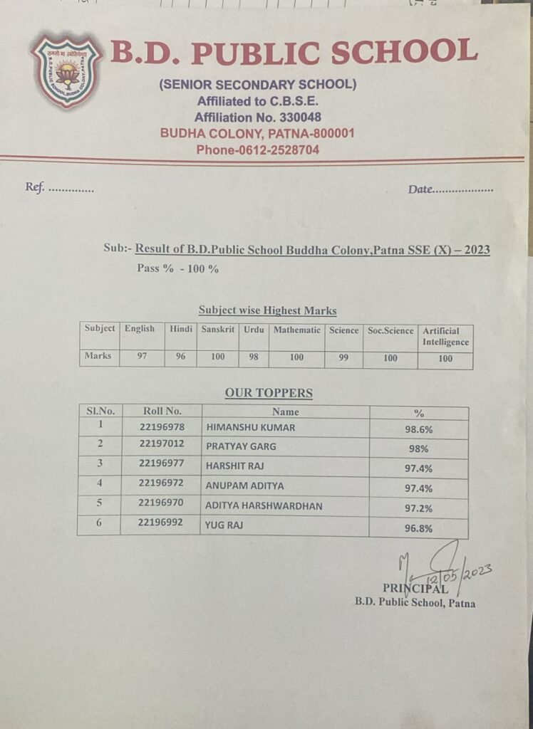 Result of B.D. Public School, Buddha Colony, Patna SSE (X)