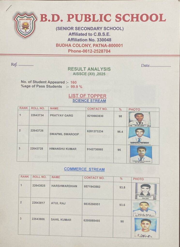 Result of B.D. Public School, Buddha Colony, Patna SSE (XII)